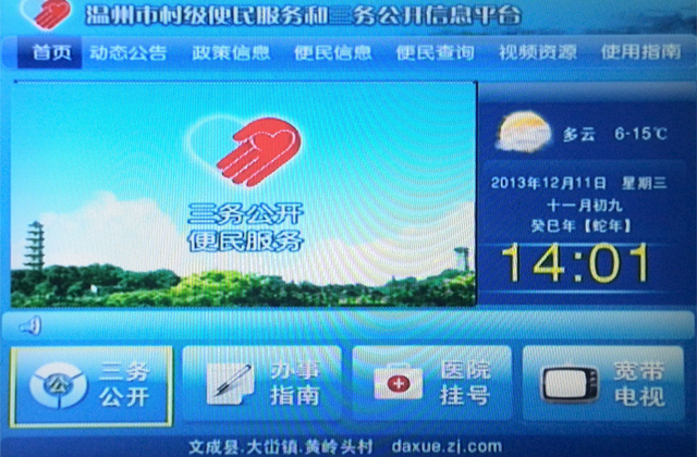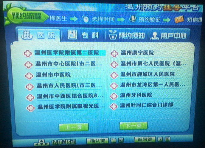 1)点击电视上的便民服务和三务公开菜单(中广有线要先按遥控器上的主页键),再选择医院挂号进入预约系统。中广有线访问需高清机顶盒或标清机顶盒加猫