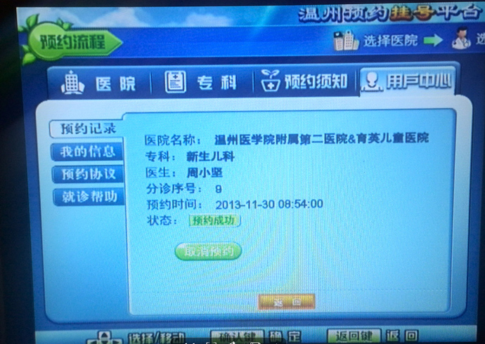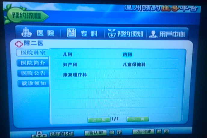 电视预约系统通过电视遥控器对系统进行操作,方向键进行移动选择,【确认】键进行确认同意,通过数字键输入患者的身份证号及手机号码,预约成功后,请按预约时间提前20分钟到达医院,请务必携带身份证件到收费处或服务台确认取号。